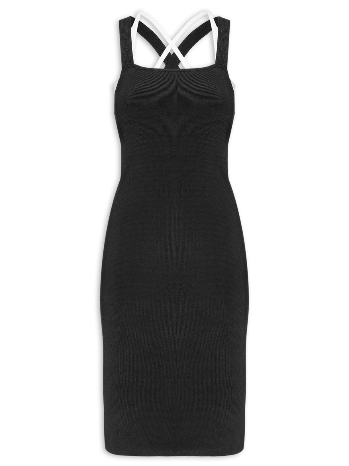 O vestido preto é confeccionado em tricot canelado com média elasticidade. A peça justa ao corpo possui decote quadrado, alças médias cruzadas na parte posterior, e comprimento curto. Acompanha top em tecido leve com alças finas cruzadas na parte posterior para uso opcional.