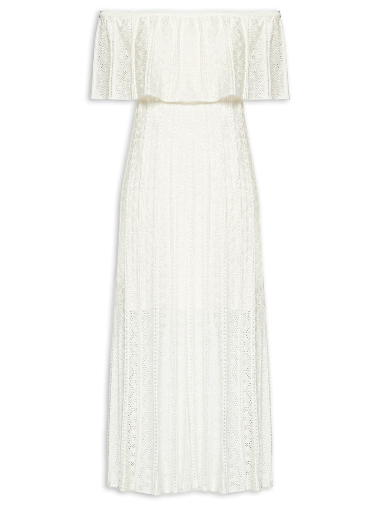 O vestido off white é confeccionado em renda com média elasticidade. A peça solta ao corpo possui decote ombro a ombro com elástico embutido na altura do decote e detalhe de tricot, sobreposição com babado, meio forro e comprimento midi.