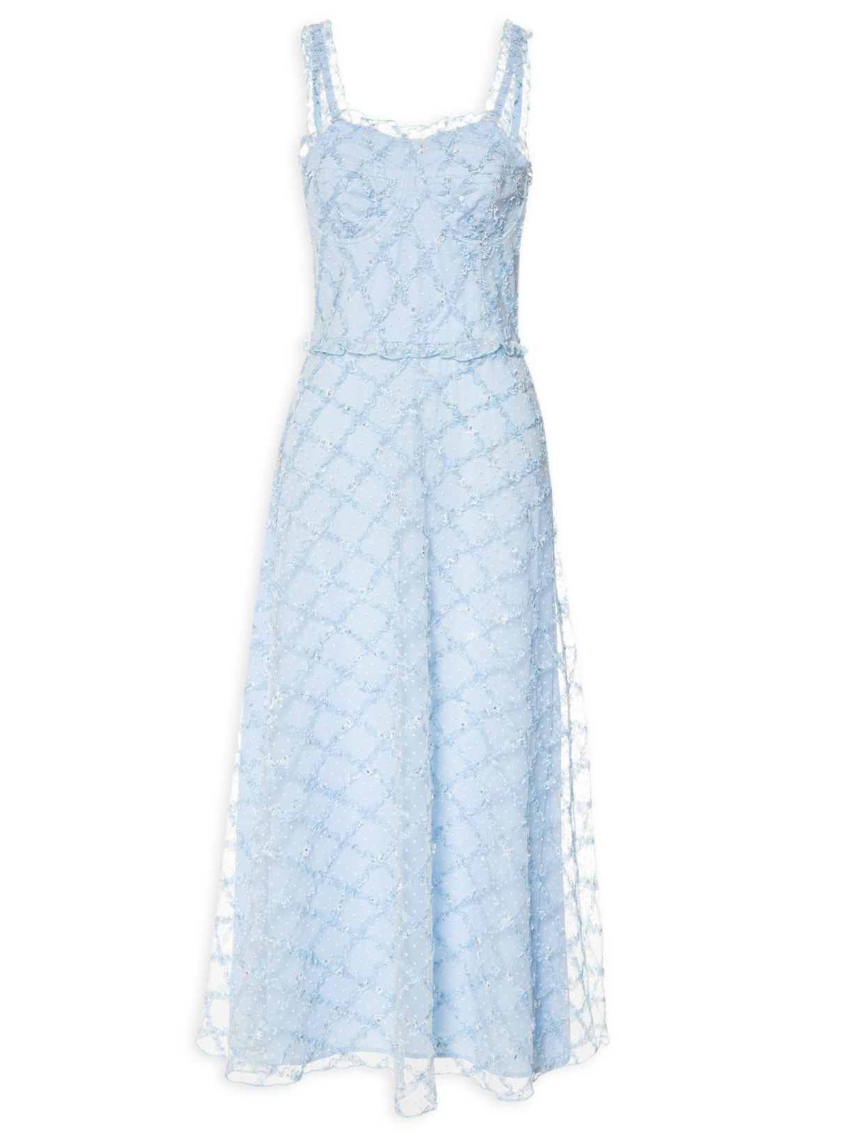 O vestido azul é confeccionado em tule com superfície resinada. A peça possui decote reto, alças finas com elásticos embutidos e babados aplicados, recortes frontais na altura do busto com aro embutido para sustentação, barbatanas para sustentação embutidas na parte frontal e posterior, recorte na altura da cintura com babados aplicados, forro, comprimento midi, shape solto e fechamento posterior por zíper metalizado.