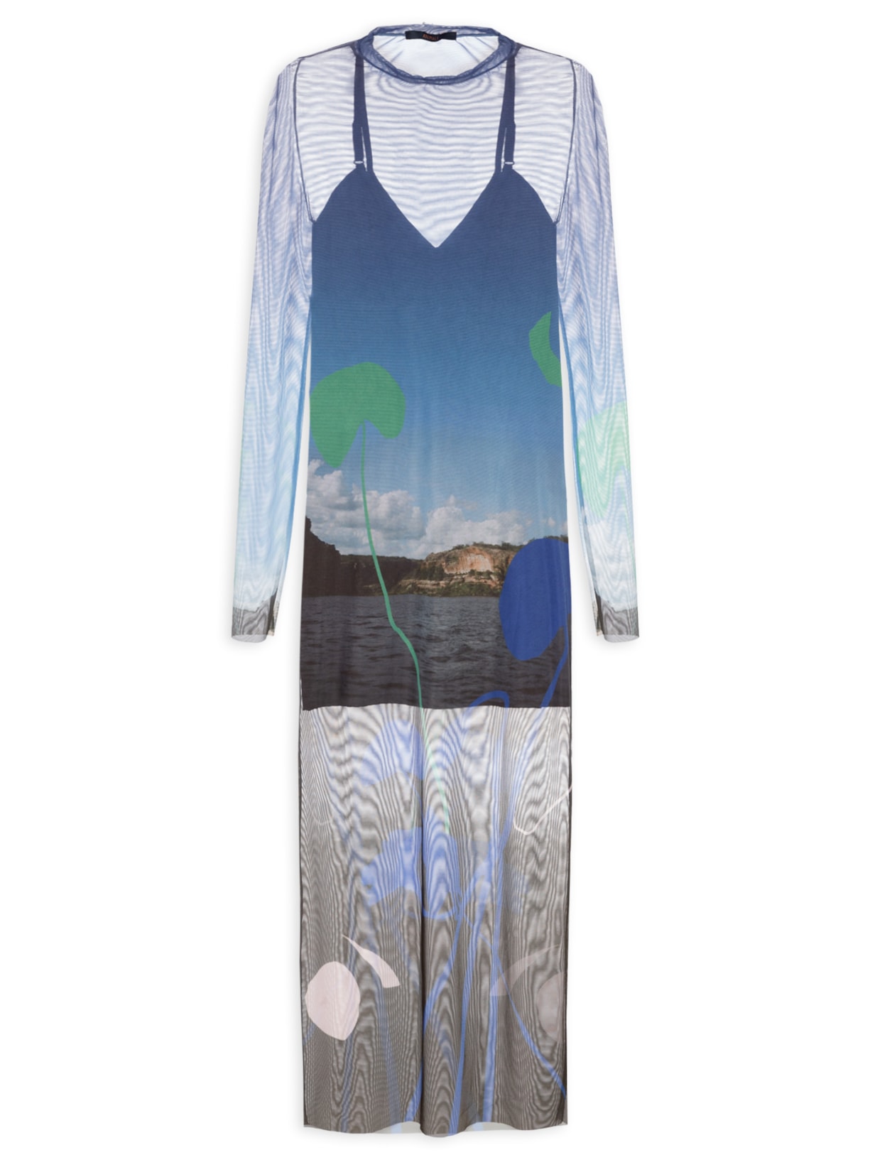 O vestido azul é confeccionado em tule com alta elasticidade. A peça justa ao corpo possui decote arredondado, mangas longas, estampa de paisagem em cores contrastantes, transparência, forro curto e com alças finas e comprimento midi.