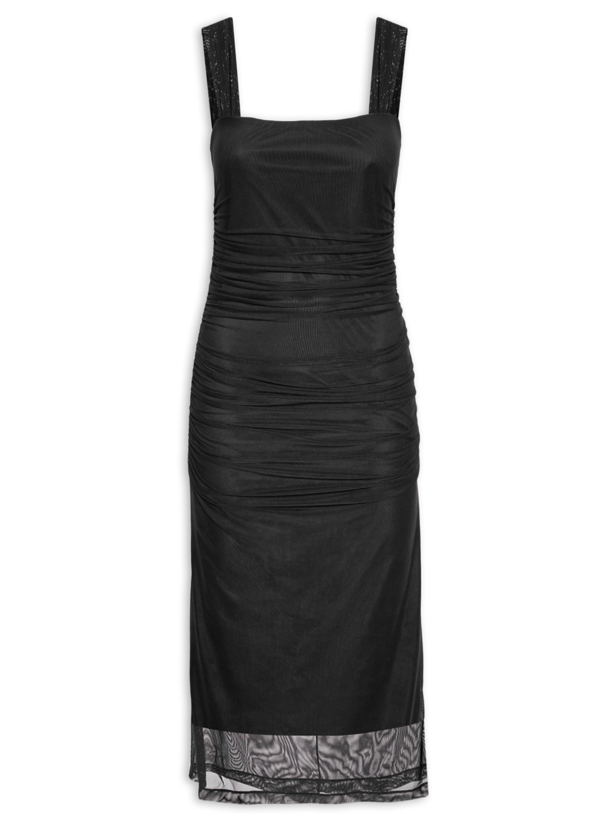 O vestido preto é confeccionado em tule com alta elasticidade. A peça justa na altura do busto e da cintura e solta no comprimento possui decote quadrado, alças médias, leve transparência, cavas regulares, sem bojo, logo da marca aplicado em metal na parte posterior, recorte posterior, forro, detalhe de franzidos nas partes laterais, drapeado posterior e frontal e comprimento midi.