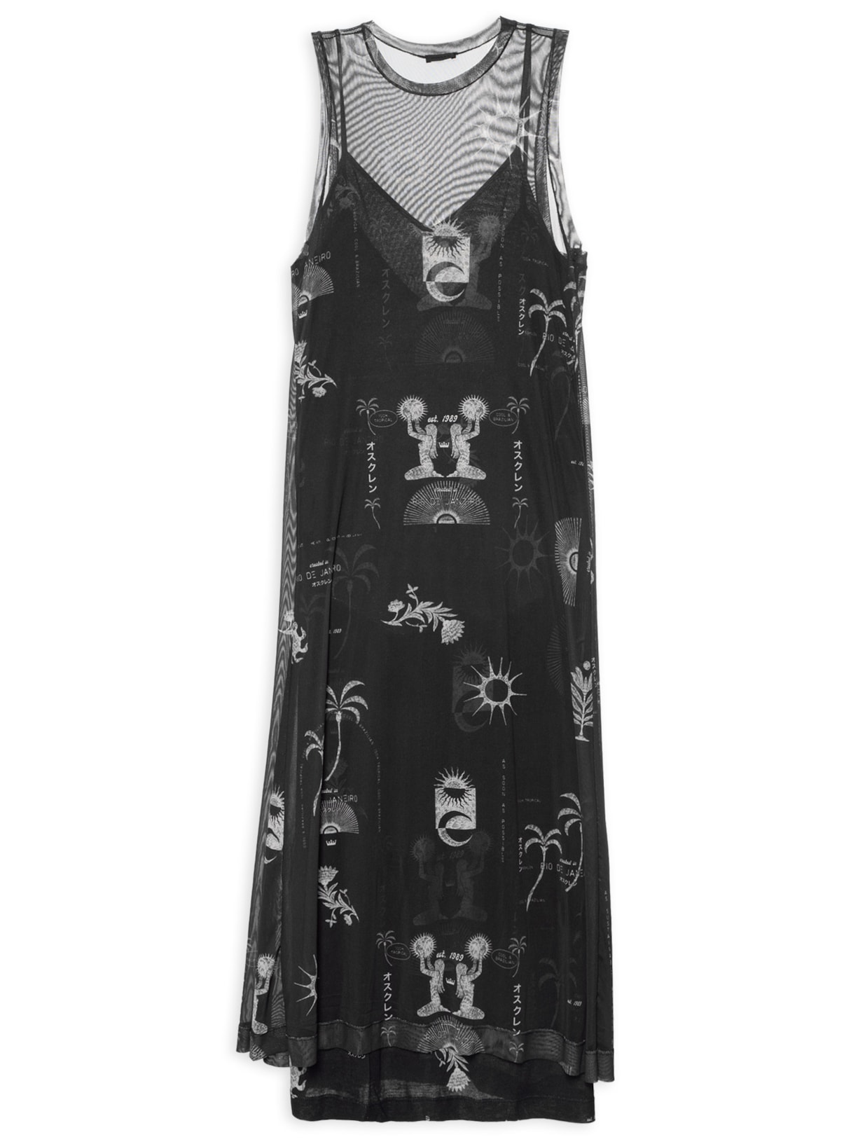 O vestido preto é confeccionado por tule com média elasticidade. A peça solta ao corpo possui gola alta, alças médias, cavas estendidas, mix de estampas em cores contrastantes, transparência e comprimento midi. Acompanha forro removível confecciondado por tecido leve com toque em linho, possui decote v, alças finas, cavas estendidas, mix de estampas em cores contrastantes e comprimento midi.
