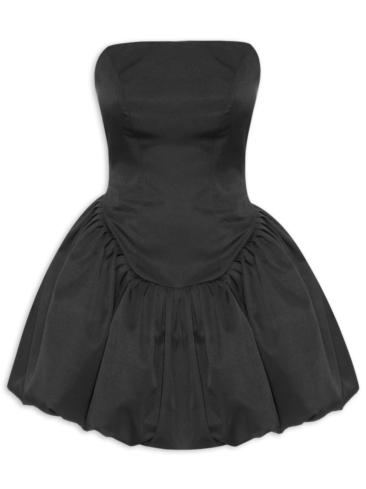 O vestido preto é confeccionado em tecido encorpado sem elasticidade. A peça justa ao corpo, de modelo tomara que caia, possui decote reto, recortes frontais e posteriores, barbatanas embutidas nas laterais, cintura deslocada com recorte arredondado e pregas, parte inferior com efeito balonê, comprimento curto, forro com aprte inferior estruturada e fechamento posterior por zíper invisível.
